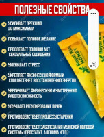 Полезные свойства: Усиливает эр***ию до максимума, повышает половое желание и ощущения. Уменьшает стресс. Укрепляет физическую формы и способствует восстановлению энергии. Увеличивает физическую и умственную работоспособность. Улучшает регулирование почек. Противодействует процессу старения. Противодействует заболевания мужской половой системы (простатит, аденома и т.п.). Состав: Натуральный тропический мед. Тонгкат Али. Маточное молок. Мака перуанская. Женьшень. Корень куркумы. Экстракт трюфеля и др. Способ употребления: Принимать 1/3 или 1/4 пакетика один раз в 2-3 дня, за пол часа ДО - еды, половой близости, и тренировок. Противопоказания: Высокое давление, диабет, детям не достигшим