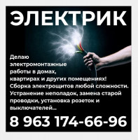 Делаю электромонтажные работы в домах, квартирах и других помещениях!Сборка электрощитов любой сложности. Устранение неполадок, замена старой проводки, установка розеток и выключателей..